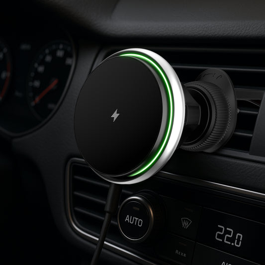 Chargeur voiture iPhone MagSafe 15 W – Support 2‑en‑1 (Grille & Ventouse)